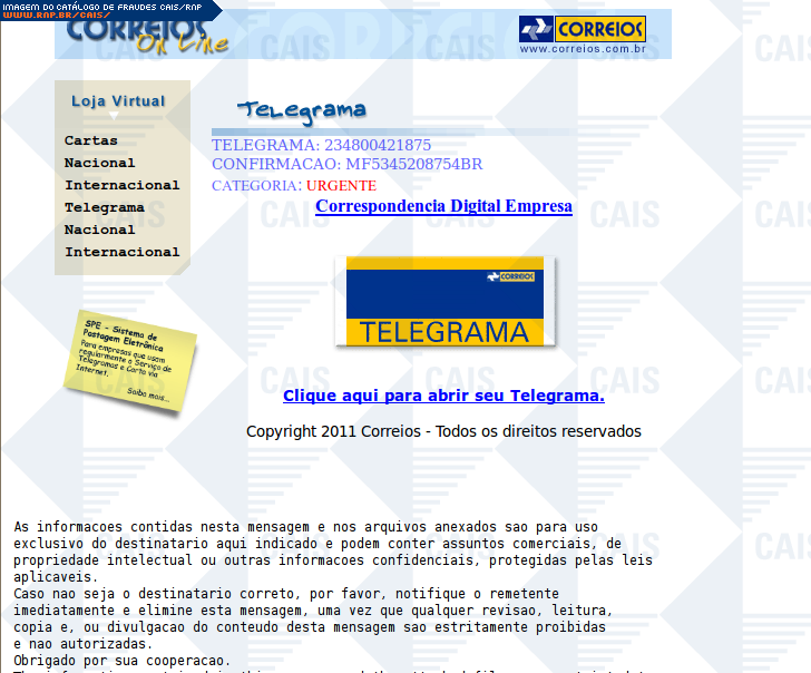 | comentário | A mensagem se passa pelo envio de um suposto telegrama. O contéudo malicioso já havia sido removido no momento da análise. | |