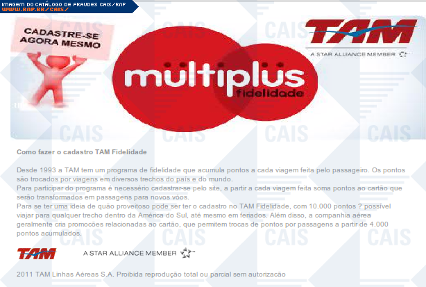 | comentário | Mensagem falsa em que a TAM estaria anunciando o programa TAM Fidelidade. O link para o cadastro na suposta promoção leva a conteúdo malicioso que não estava disponível no momento da análise. | |