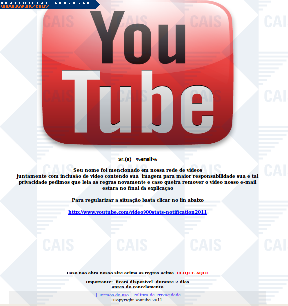 | comentário | A mensagem se passa por um comunicado do youtube.com que informa que o nome da vítima foi mencionado em um vídeo. O link para o suposto vídeo leva a um software malicioso que foi identificado como Trojan.Downloader.VB.VON (BitDefender). | |