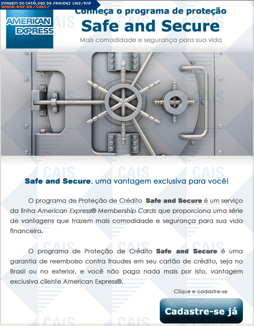 | comentário | A mensagem usa o nome da American Express para divulgar o Programa Safe and Secure. O link para a realização do cadastro leva a conteúdo malicioso que já havia sido removido no momento da análise. | |