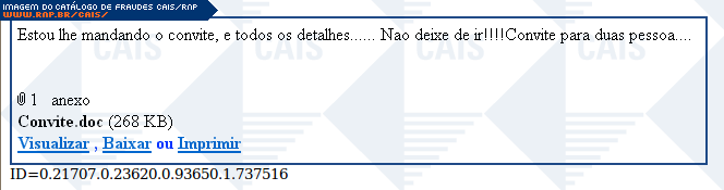 | comentário | A mensagem, que teria sido enviada por um amigo da vítima, contém um link para um convite. O link leva ao malware Trojan-Banker.Win32.Banbra.ajti (Kaspersky). | |