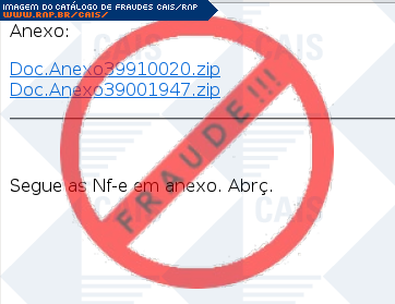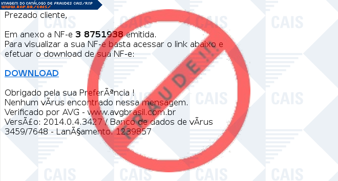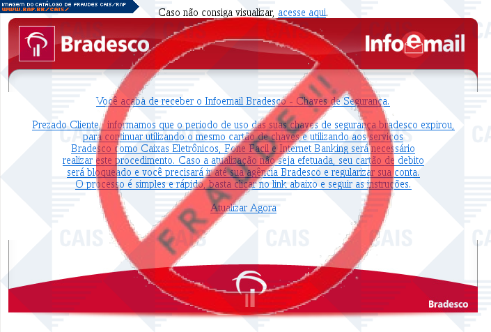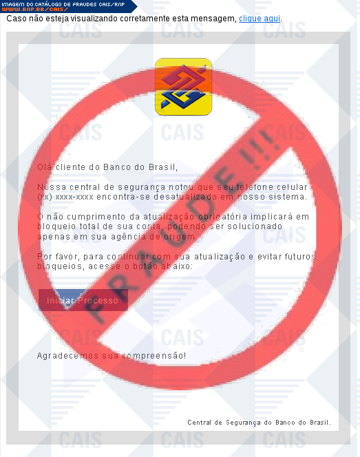 Esta página tem função informativa e educativa. Exibe uma coleção de imagens de phishing scam (fraudes eletrônicas) ou malware (código malicioso) veiculados por meio de spam (e-mail não-solicitado). Trata-se de conteúdo exemplificativo, não exaustivo, uma vez que não é possível contemplar todos os casos de fraudes existentes. Assim, caso você tenha conhecimento de um exemplar que não esteja aqui presente, isto não significa que não seja válido ou real. Inclusive incentivamos que você o envie para análise do CAIS para que, se for o caso, passe a integrar o nosso acervo.