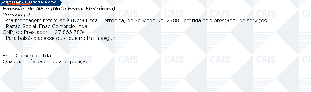 Com a disponibilização pública deste serviço, não é intenção do Centro de Atendimento a Incidentes de Segurança (CAIS) da Rede Nacional de Ensino e Pesquisa (RNP) violar direitos autorais sobre marcas registradas ou logotipos de empresas que porventura constem das amostras. O objetivo é tão somente alertar os usuários sobre as espécies de golpes que se utilizam de tais propriedades intelectuais ou industriais de forma criminosa.