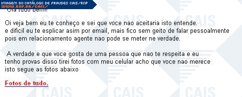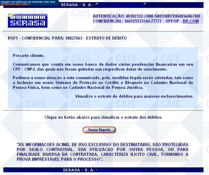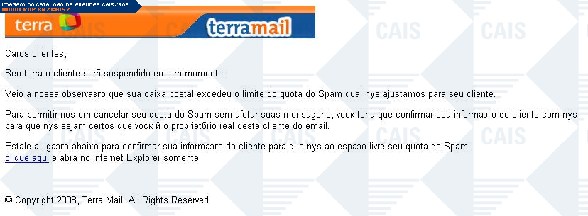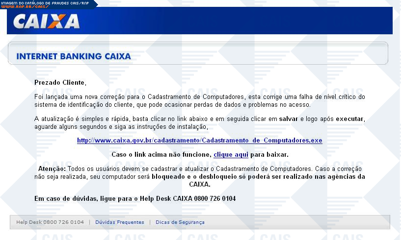 Esta página tem função informativa e educativa. Exibe uma coleção de imagens de phishing scam (fraudes eletrônicas) ou malware (código malicioso) veiculados por meio de spam (e-mail não-solicitado). Trata-se de conteúdo exemplificativo, não exaustivo, uma vez que não é possível contemplar todos os casos de fraudes existentes. Assim, caso você tenha conhecimento de um exemplar que não esteja aqui presente, isto não significa que não seja válido ou real. Inclusive incentivamos que você o envie para análise do CAIS para que, se for o caso, passe a integrar o nosso acervo.
