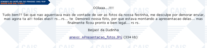 | comentário | Mais um exemplo de fraude do tipo "fotos", este caso a mensagem informa sobre fotos que foram tiradas "na festinha". O arquivo malicioso, visualizar.exe, atrelado ao link foi identificado por antivirus como Trojan.Downloader.Banload-4568 | |