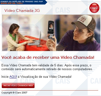 | comentário | Mais uma fraude que utiliza o nome da operadora Claro. Neste caso é informado do recebimento de uma Vídeo Chamada. Podemos observar na mensagem que não existe identificação da origem e destino da mensagem, um típico exemplo de fraude impessoal. O arquivo... (leia mais) | |