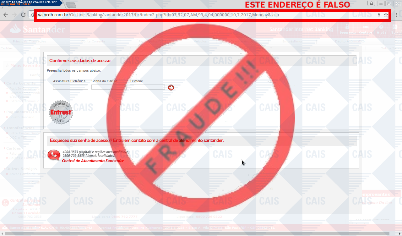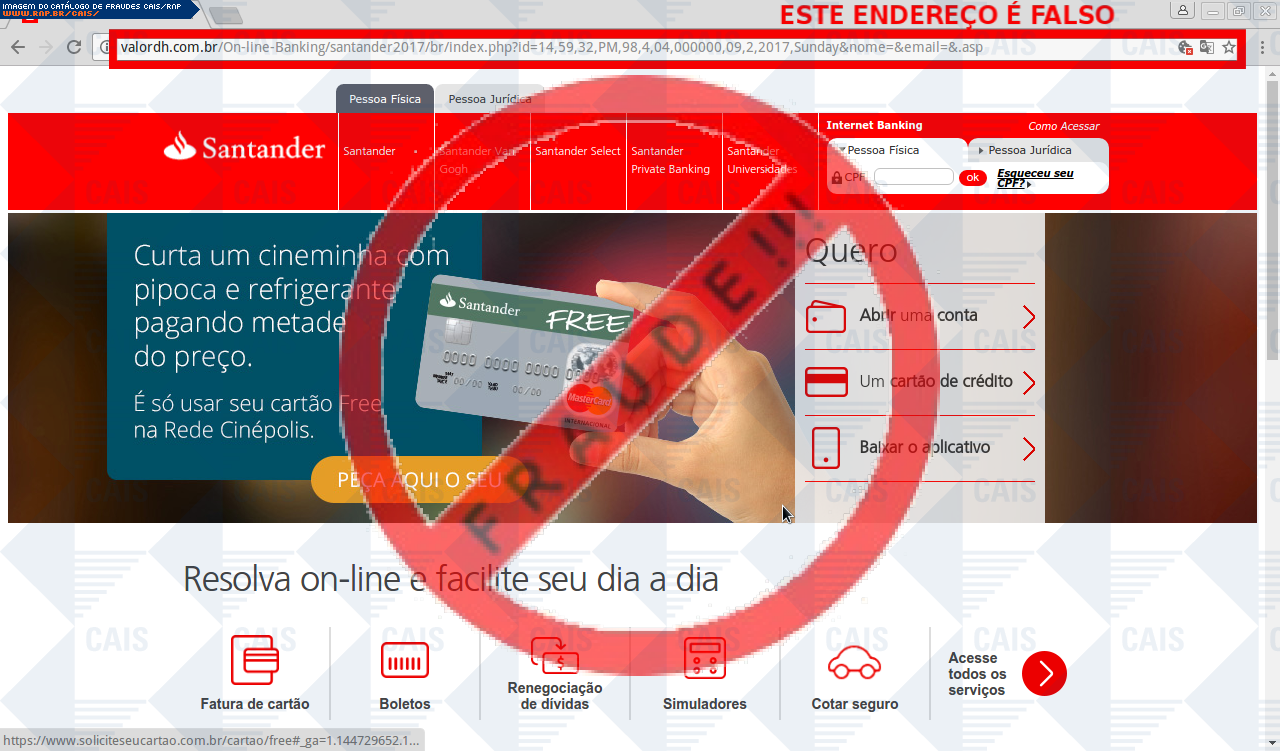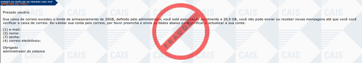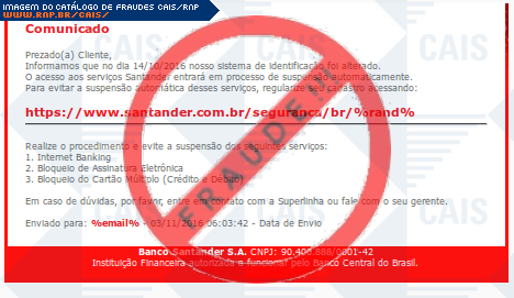 Esta página tem função informativa e educativa. Exibe uma coleção de imagens de phishing scam (fraudes eletrônicas) ou malware (código malicioso) veiculados por meio de spam (e-mail não-solicitado). Trata-se de conteúdo exemplificativo, não exaustivo, uma vez que não é possível contemplar todos os casos de fraudes existentes. Assim, caso você tenha conhecimento de um exemplar que não esteja aqui presente, isto não significa que não seja válido ou real. Inclusive incentivamos que você o envie para análise do CAIS para que, se for o caso, passe a integrar o nosso acervo.