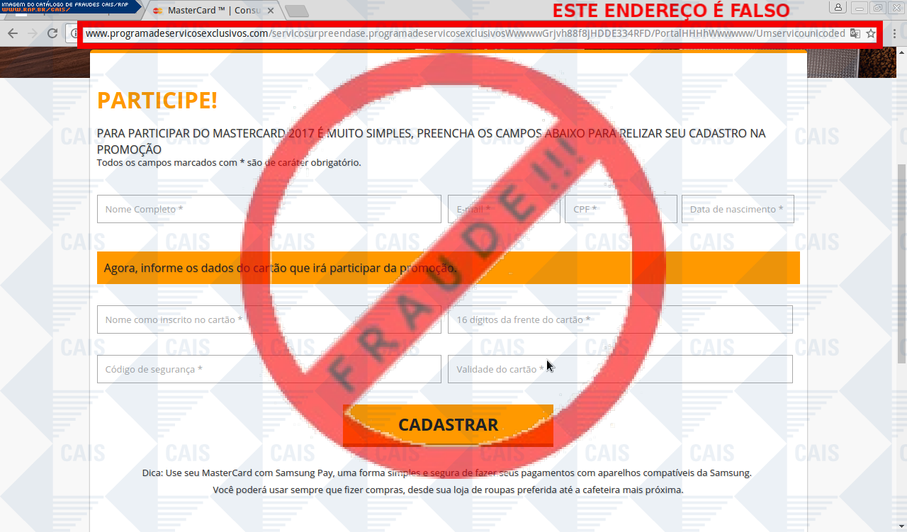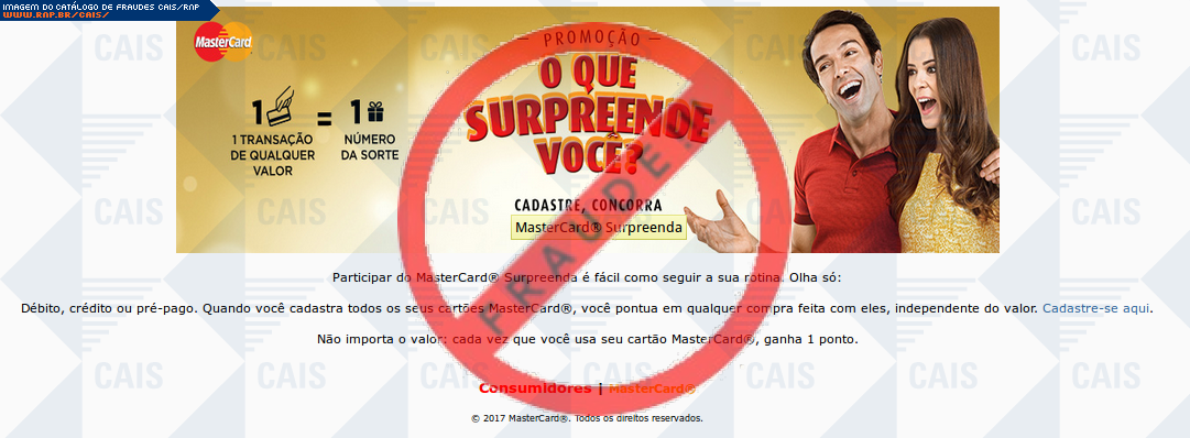 | comentário | A vítima recebe um e-mail informando sobre as vantagens da promoção compra premiada do cartão MasterCard sendo o cadastro através do link disponibilizado, no entanto a página é falsa criada para roubar informações do usuário. | |