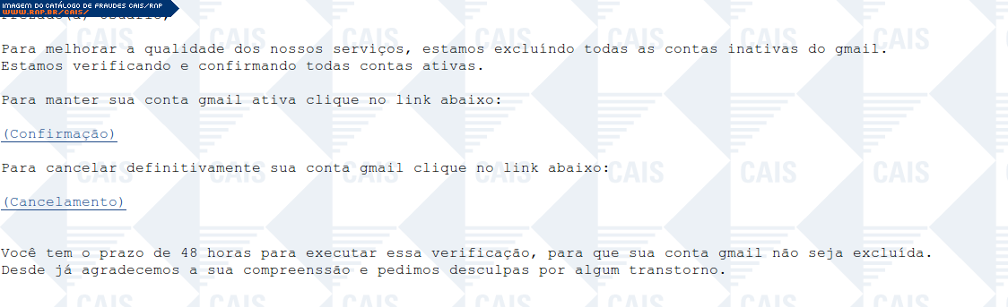 | comentário | Fraude contendo mensagem supostamente do Gmail anunciando a exclusão de contas inativas do sistema. A conta da vítima estaria incluída entre as passíveis de exclusão. Para evitar que isto fosse feito a vítima deveria acessar um link fornecido na mensagem.... (leia mais) | |