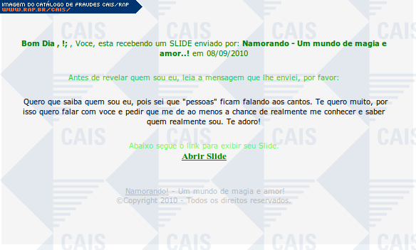 | comentário | Mensagem se passando por cartão virtual enviado através do site namorando.com.br. O link para visualização do cartão leva a um malware identificado como Trojan.Crypt.Delf.AG (F-Secure). | |