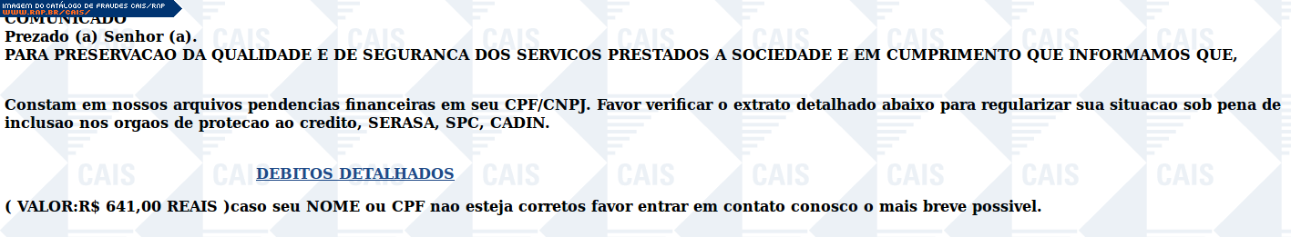 Com a disponibilização pública deste serviço, não é intenção do Centro de Atendimento a Incidentes de Segurança (CAIS) da Rede Nacional de Ensino e Pesquisa (RNP) violar direitos autorais sobre marcas registradas ou logotipos de empresas que porventura constem das amostras. O objetivo é tão somente alertar os usuários sobre as espécies de golpes que se utilizam de tais propriedades intelectuais ou industriais de forma criminosa.
