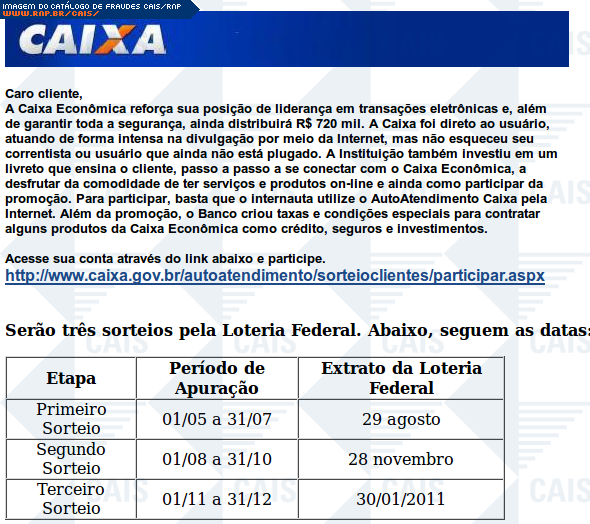 | comentário | Mensagem supostamente da Caixa anunciando sorteios pela Loteria Federal de prêmios no total de R$ 720,00. Seriam três sorteios, com o último sendo realizado em 2011. A fraude fornece um link através do qual a vítima se cadastraria nos sorteios. Tal link leva... (leia mais) | |