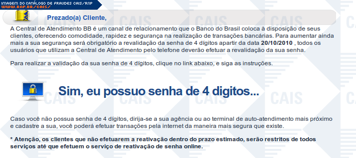 | comentário | Mensagem se passando pelo Banco do Brasil notificando clientes com senha de 4 dígitos a trocarem suas senhas. O link para realização da troca leva a conteúdo malicioso já retirado da Internet no momento da análise. | |