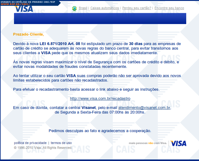 Esta página tem função informativa e educativa. Exibe uma coleção de imagens de phishing scam (fraudes eletrônicas) ou malware (código malicioso) veiculados por meio de spam (e-mail não-solicitado). Trata-se de conteúdo exemplificativo, não exaustivo, uma vez que não é possível contemplar todos os casos de fraudes existentes. Assim, caso você tenha conhecimento de um exemplar que não esteja aqui presente, isto não significa que não seja válido ou real. Inclusive incentivamos que você o envie para análise do CAIS para que, se for o caso, passe a integrar o nosso acervo.