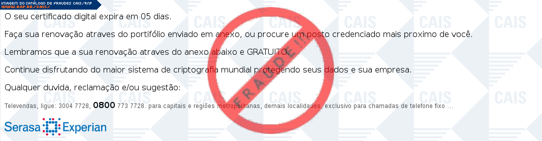 | comentário | O usuário recebe uma mensagem contendo renovação do certificado digital da Serasa Experian disponível para download, no entanto o arquivo originado é malicioso criado para roubar informações da vítima e instalar outros arquivos fraudulentos com o nome de... (leia mais) | |