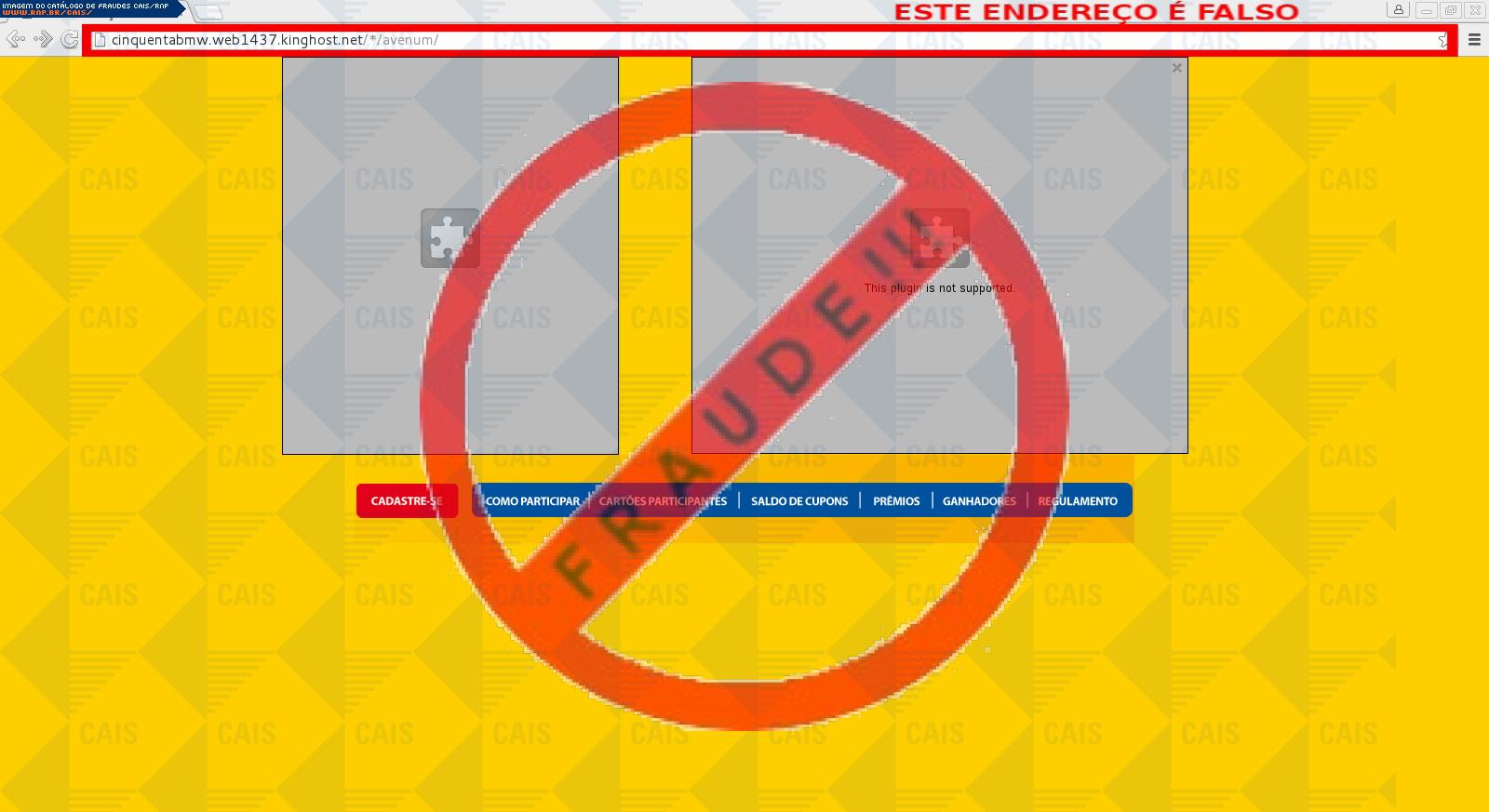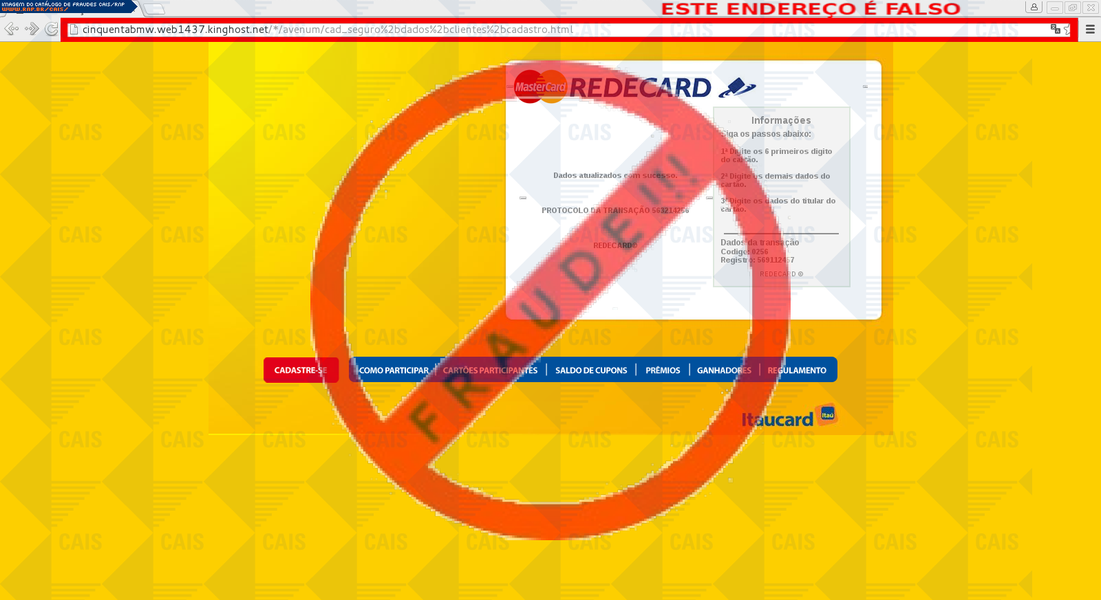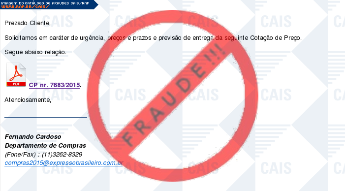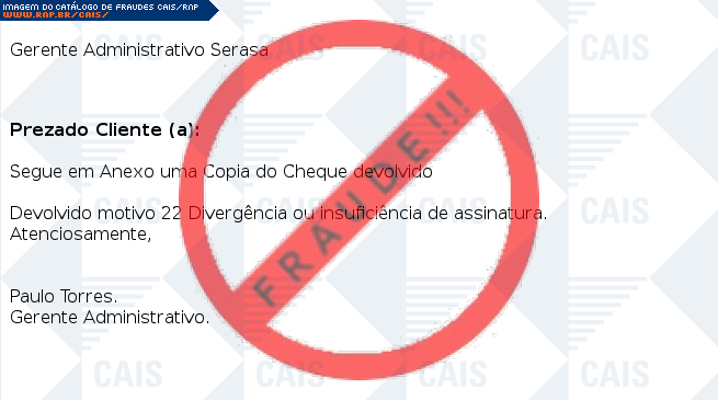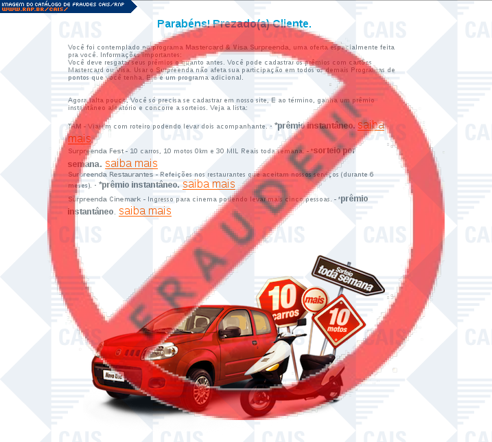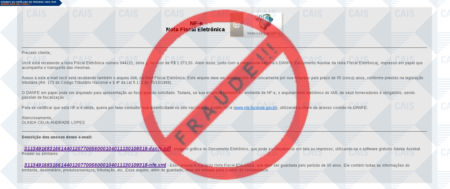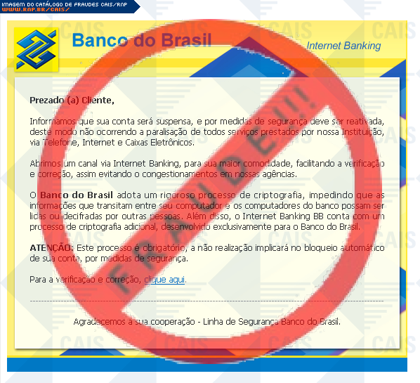 Esta página tem função informativa e educativa. Exibe uma coleção de imagens de phishing scam (fraudes eletrônicas) ou malware (código malicioso) veiculados por meio de spam (e-mail não-solicitado). Trata-se de conteúdo exemplificativo, não exaustivo, uma vez que não é possível contemplar todos os casos de fraudes existentes. Assim, caso você tenha conhecimento de um exemplar que não esteja aqui presente, isto não significa que não seja válido ou real. Inclusive incentivamos que você o envie para análise do CAIS para que, se for o caso, passe a integrar o nosso acervo.