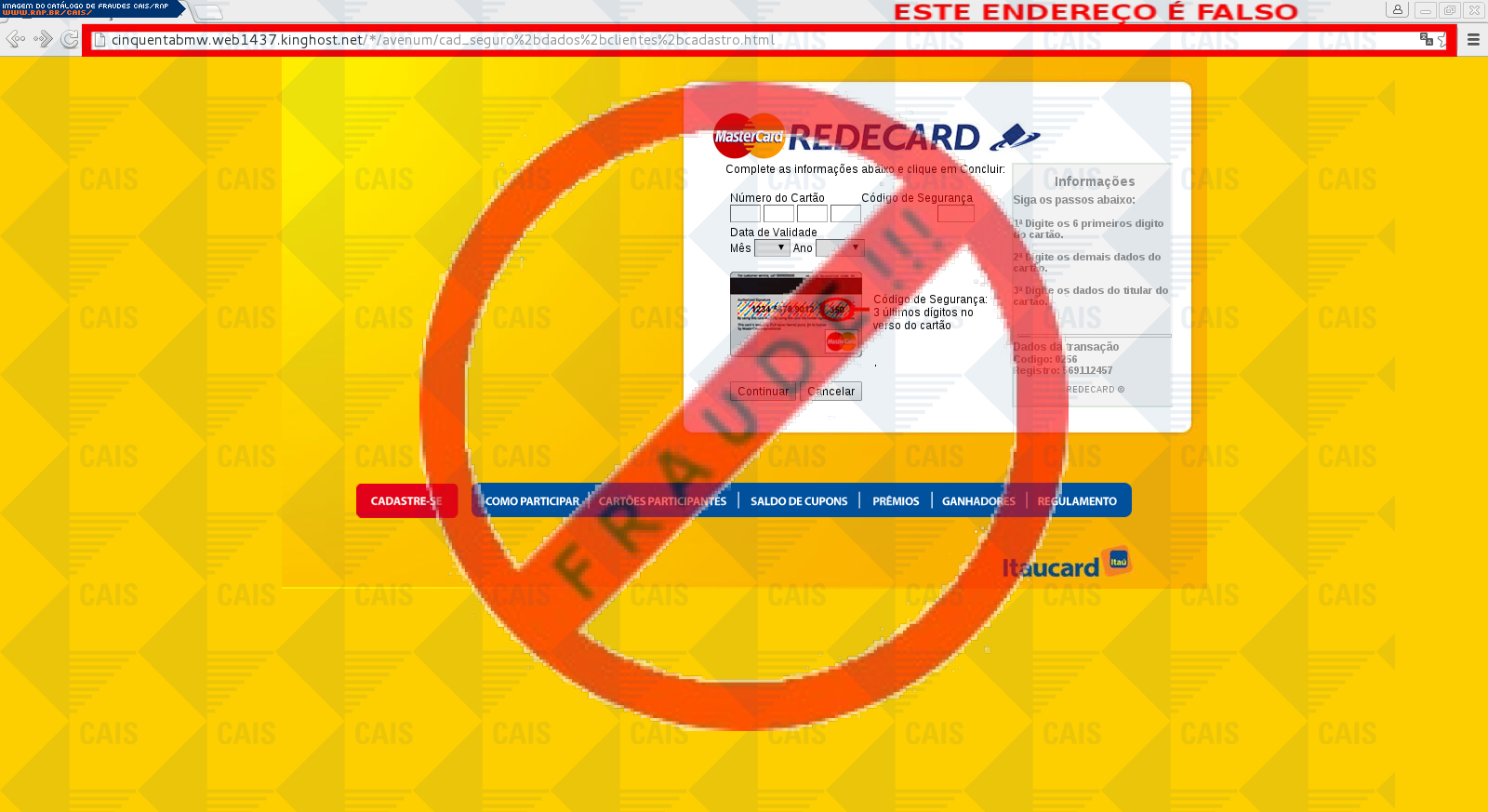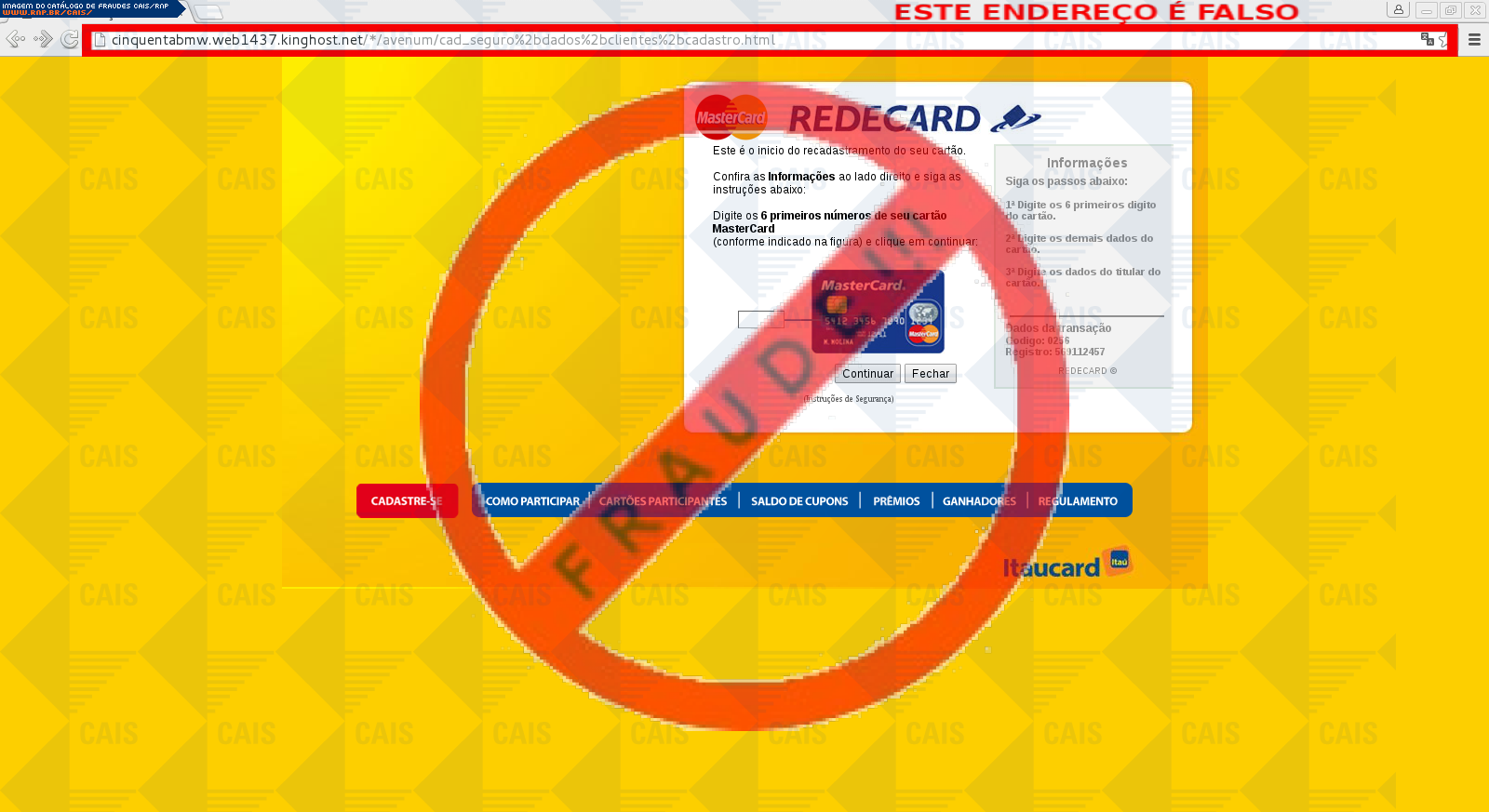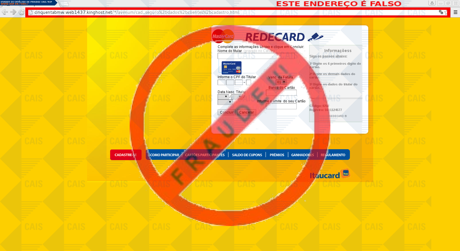 Esta página tem função informativa e educativa. Exibe uma coleção de imagens de phishing scam (fraudes eletrônicas) ou malware (código malicioso) veiculados por meio de spam (e-mail não-solicitado). Trata-se de conteúdo exemplificativo, não exaustivo, uma vez que não é possível contemplar todos os casos de fraudes existentes. Assim, caso você tenha conhecimento de um exemplar que não esteja aqui presente, isto não significa que não seja válido ou real. Inclusive incentivamos que você o envie para análise do CAIS para que, se for o caso, passe a integrar o nosso acervo.