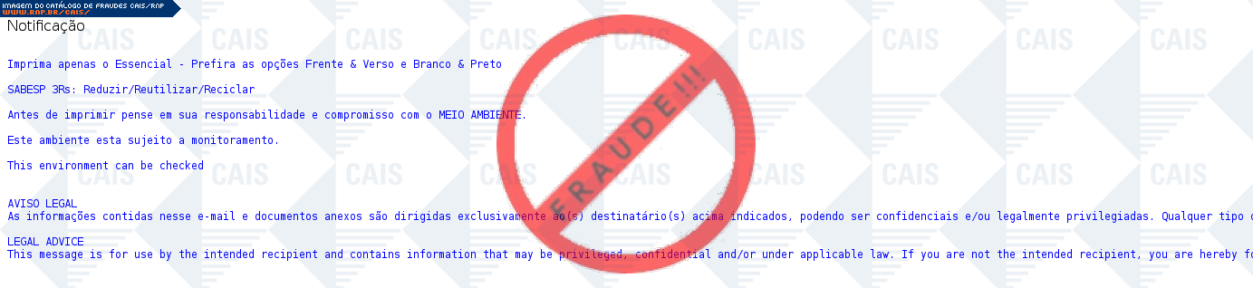 Com a disponibilização pública deste serviço, não é intenção do Centro de Atendimento a Incidentes de Segurança (CAIS) da Rede Nacional de Ensino e Pesquisa (RNP) violar direitos autorais sobre marcas registradas ou logotipos de empresas que porventura constem das amostras. O objetivo é tão somente alertar os usuários sobre as espécies de golpes que se utilizam de tais propriedades intelectuais ou industriais de forma criminosa.