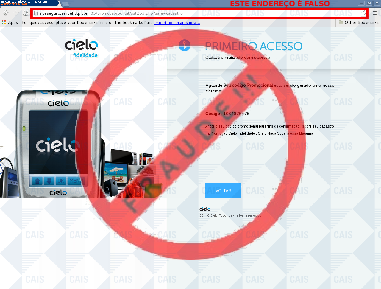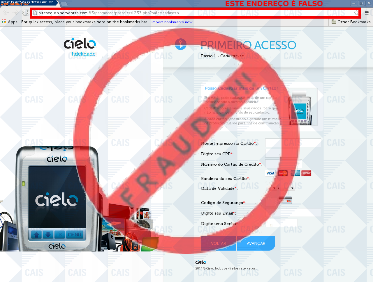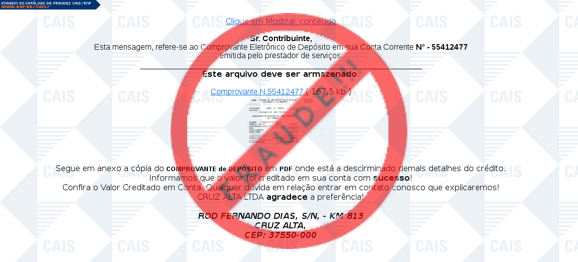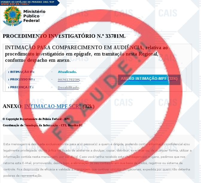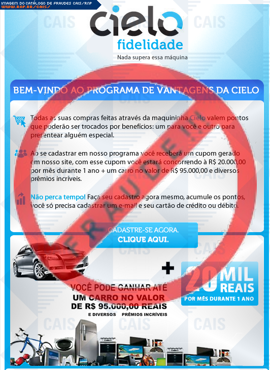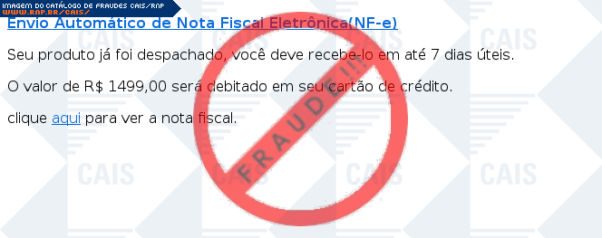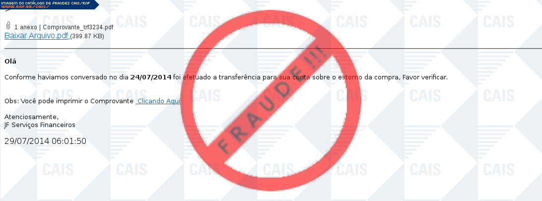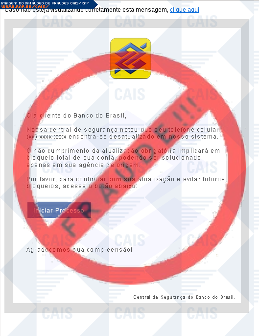 Esta página tem função informativa e educativa. Exibe uma coleção de imagens de phishing scam (fraudes eletrônicas) ou malware (código malicioso) veiculados por meio de spam (e-mail não-solicitado). Trata-se de conteúdo exemplificativo, não exaustivo, uma vez que não é possível contemplar todos os casos de fraudes existentes. Assim, caso você tenha conhecimento de um exemplar que não esteja aqui presente, isto não significa que não seja válido ou real. Inclusive incentivamos que você o envie para análise do CAIS para que, se for o caso, passe a integrar o nosso acervo.