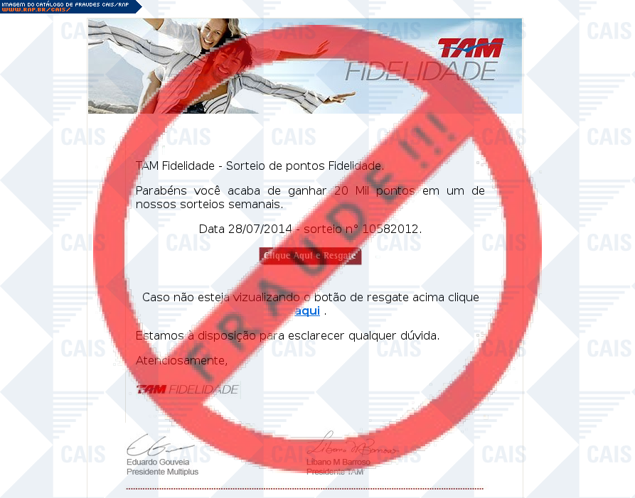 | comentário | O usuário recebe um e-mail informando que ganhou pontos em um programa fidelidade para compra de passagens, entretanto a página para resgate é falsa destinada a roubar os dados e informações do usuário. | |