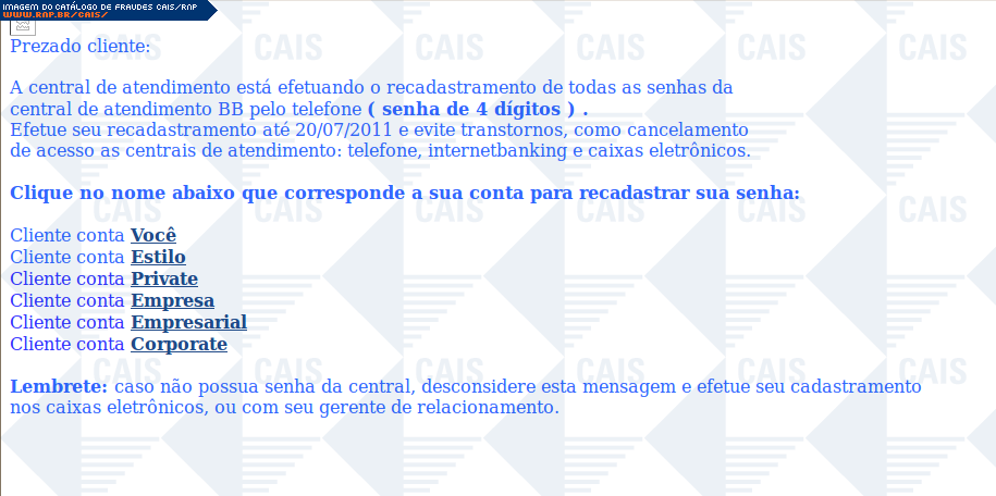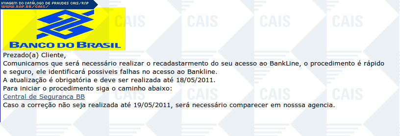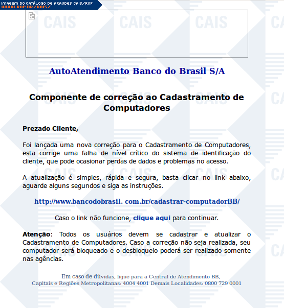 | comentário | Mensagem se passando pelo Banco do Brasil notificando uma correção para o cadastro de computadores, necessário para acesso ao Internet Banking. O link para a suposta correção leva a um site falso destinado a roubar dados da conta da vítima. | |
