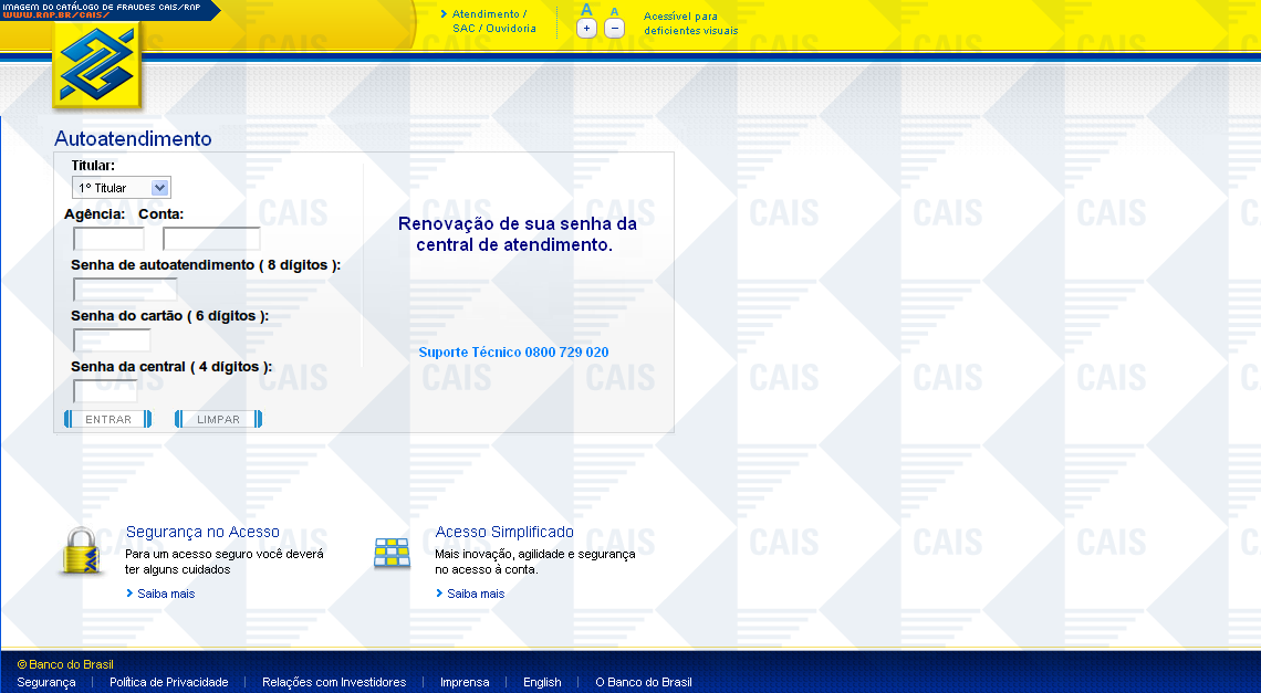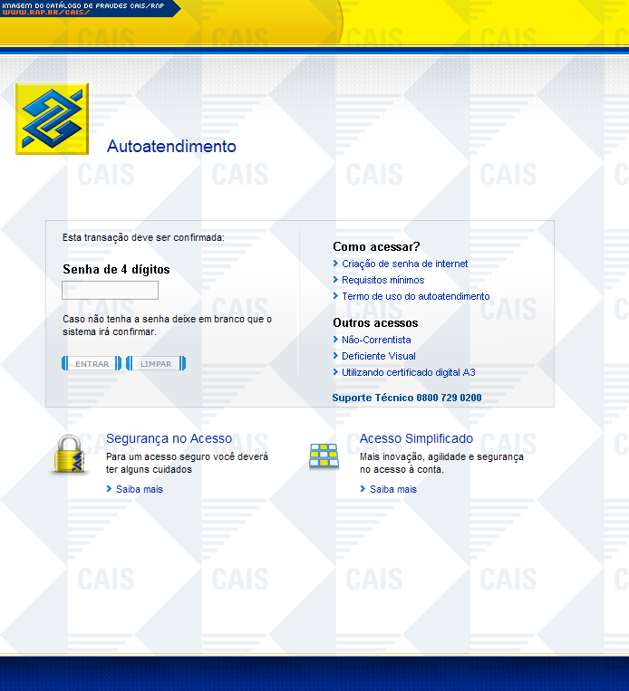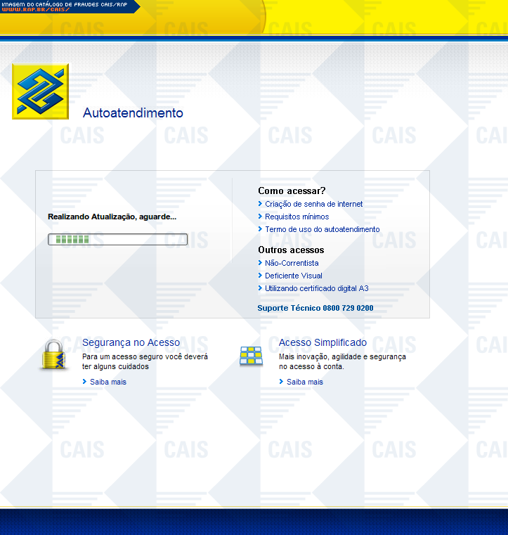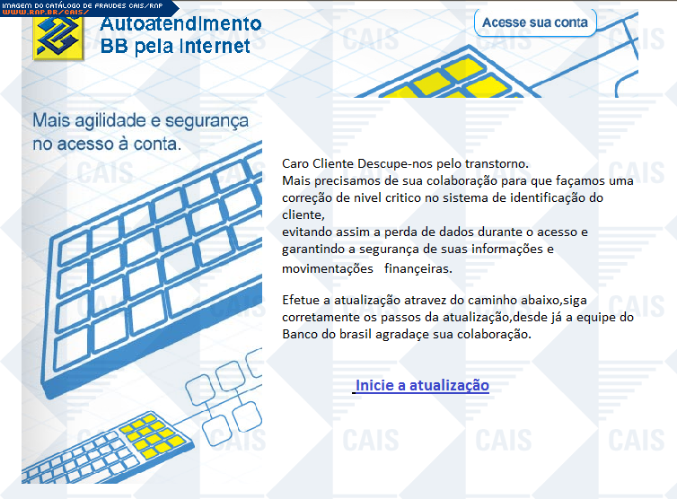 | comentário | A fraude usa o nome do Banco do Brasil para pedir que a vítima realize a atualização de sua senha de auto-atendimento. O link para a suposta atualização leva a conteúdo malicioso que já havia sido removido no momento da análise. | |