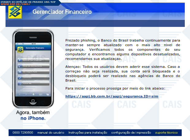 | comentário | A fraude se passa por um comunicado do Banco do Brasil que solicita que a vítima realize a correção de falhas no sistema de identificação. Observe que a mensagem contém diversos erros ortográficos. O conteúdo malicioso não estava disponível no momento da... (leia mais) | |
