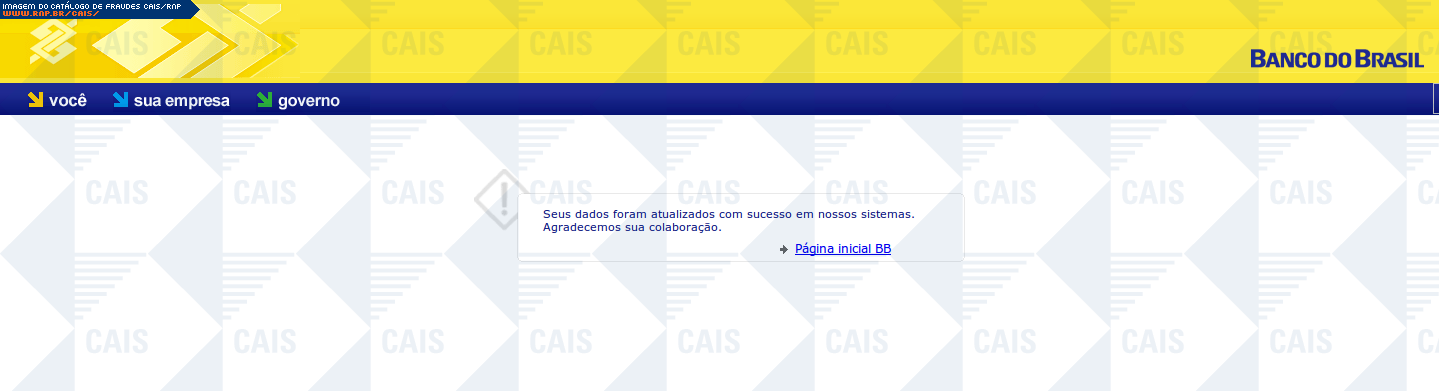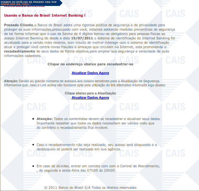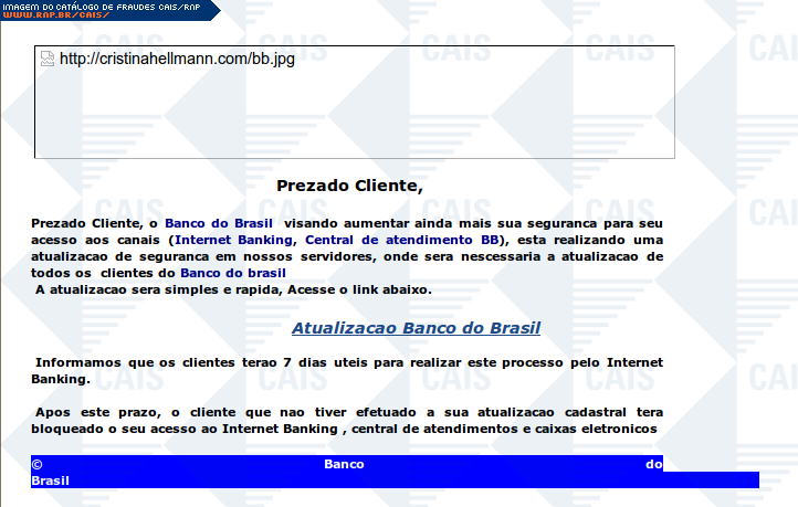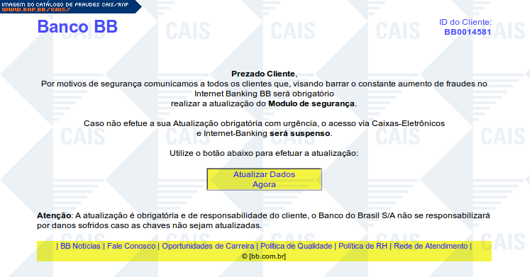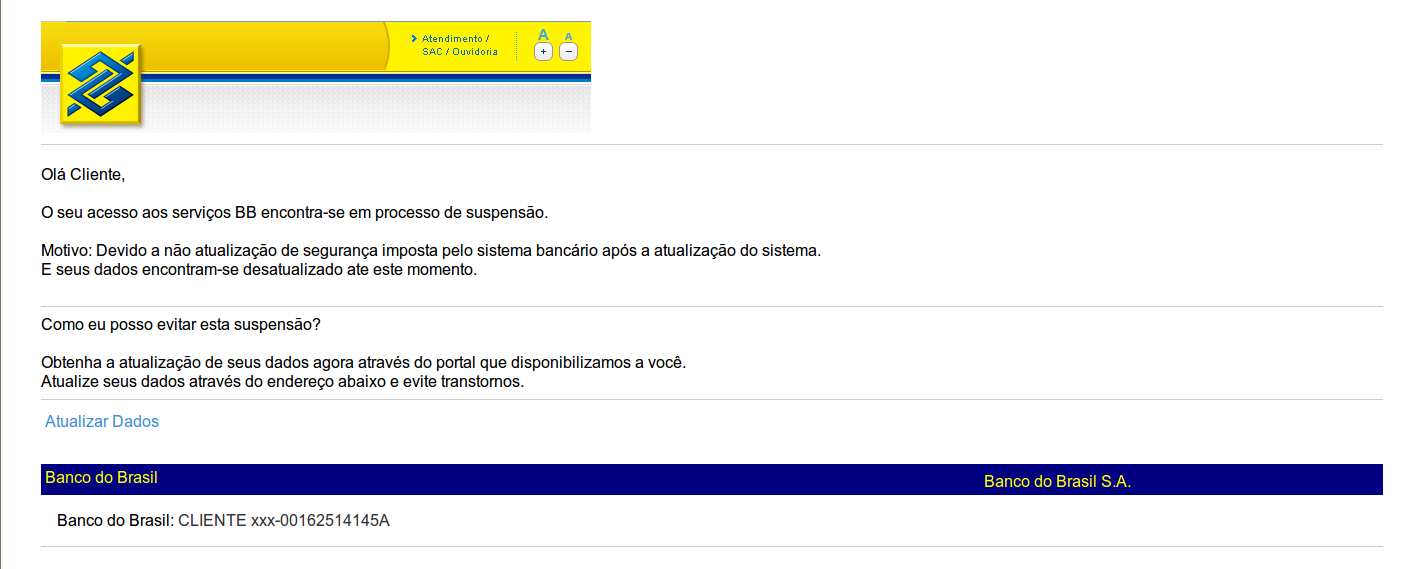 | comentário | Comunicado falso em nome do Banco do Brasil que tenta aliciar a vítima a realizar uma suposta atualização de dados. A fraude contém um link que leva a uma página falsa, destinada a roubar dados da conta bancária da vítima. | |