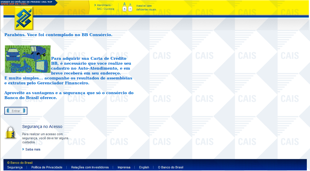 | comentário | A fraude se passa por um comunicado do Banco do Brasil que informa que a vítima foi contemplada no BB Consórcio. A mensagem pede que a vítima realize o cadastro no auto-atendimento para receber sua carta de crédito. O link para o suposto cadastro leva a uma... (leia mais) | |