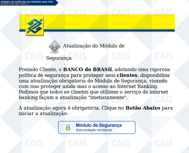 | comentário | A fraude usa o nome do Banco do Brasil para informar que a vítima deve realizer a atualização do módulo de segurança. A mensagem contém um link que leva a uma página falsa, destinada a coletar dados da conta bancária da vítima. | |