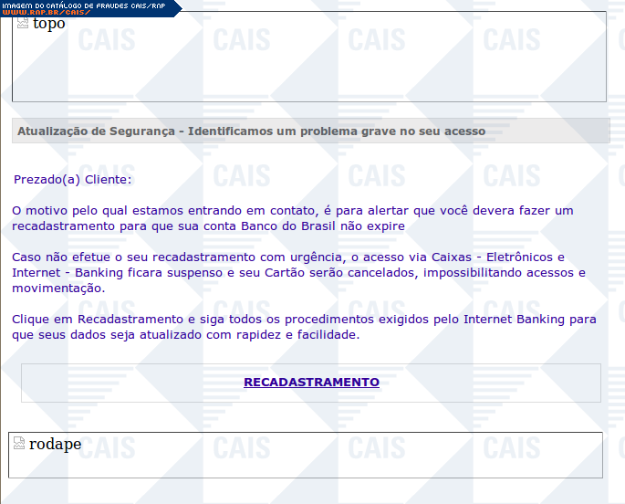 | comentário | Comunicado falso, em nome do Banco do Brasil, informando que a vítima deverá realizar o recadastramento de sua conta. A mensagem contém alguns erros ortográficos. A fraude contém um link que leva a conteúdo malicioso que não estava disponível no momento da... (leia mais) | |