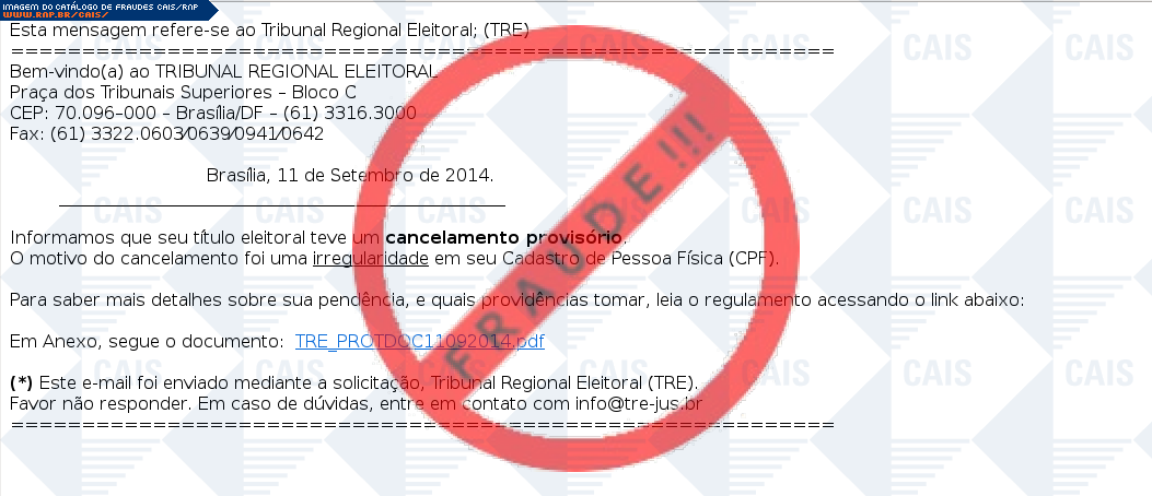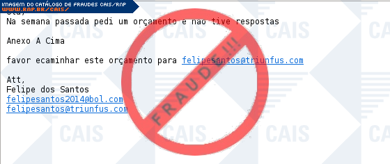 Esta página tem função informativa e educativa. Exibe uma coleção de imagens de phishing scam (fraudes eletrônicas) ou malware (código malicioso) veiculados por meio de spam (e-mail não-solicitado). Trata-se de conteúdo exemplificativo, não exaustivo, uma vez que não é possível contemplar todos os casos de fraudes existentes. Assim, caso você tenha conhecimento de um exemplar que não esteja aqui presente, isto não significa que não seja válido ou real. Inclusive incentivamos que você o envie para análise do CAIS para que, se for o caso, passe a integrar o nosso acervo.