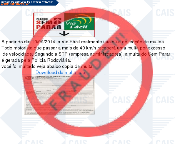 | comentário | A vítima recebe uma mensagem contendo uma infração disponível para download, no entanto o arquivo gerado é malicioso destinado a roubar informações do usuário com o nome de Gen:Trojan.Heur.GM.0400460010. | |