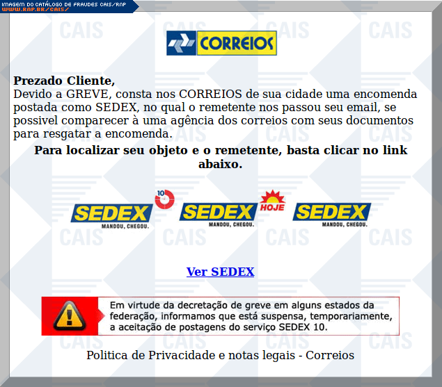 | comentário | Mensagem que noticia sobre uma greve nos Correios. De acordo com a mensagem o remetente do suposto SEDEX informou o e-mail do usuário, que foi utilizado para o contato. A mensagem contém um link que levaria a mais informações sobre o remetente (cidade de... (leia mais) | |