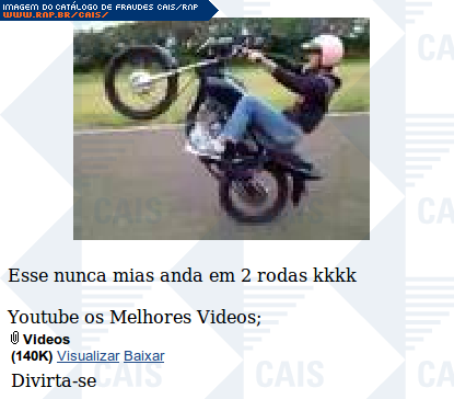 | comentário | Mensagem anunciando vídeo com suposto acidente de um motoqueiro. A fraude contém uma imagem de um motoqueiro empinado sua moto, deixando a entender ser uma cena do vídeo. O link para o vídeo leva a um conteúdo malicioso identificado como Gen:Trojan.Heur.ii0arHpoGBciu... (leia mais) | |