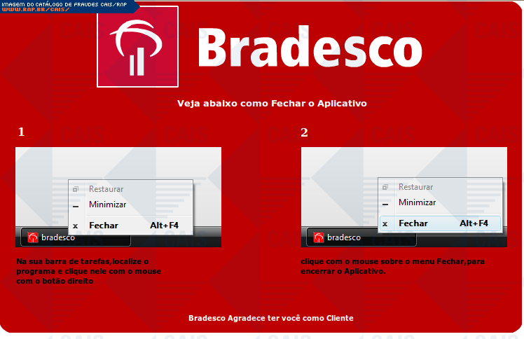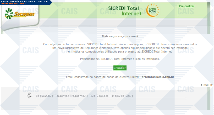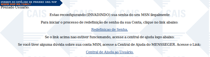 Esta página tem função informativa e educativa. Exibe uma coleção de imagens de phishing scam (fraudes eletrônicas) ou malware (código malicioso) veiculados por meio de spam (e-mail não-solicitado). Trata-se de conteúdo exemplificativo, não exaustivo, uma vez que não é possível contemplar todos os casos de fraudes existentes. Assim, caso você tenha conhecimento de um exemplar que não esteja aqui presente, isto não significa que não seja válido ou real. Inclusive incentivamos que você o envie para análise do CAIS para que, se for o caso, passe a integrar o nosso acervo.