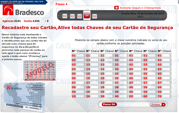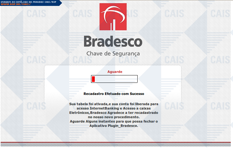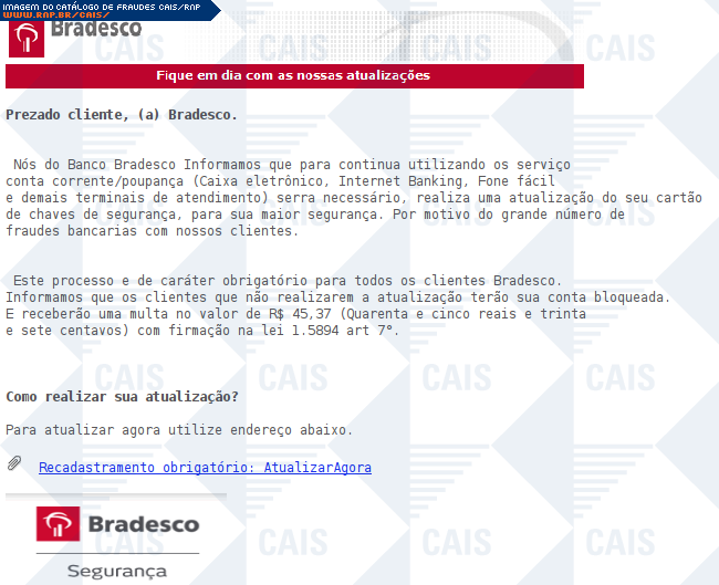 | comentário | Fraude bem comum, em nome do Banco Bradesco, solicitando que o cliente faça o recadastramento do seu cartão de chaves de segurança. O email informa ainda que, se o cliente não realizar o recadastramento, terá sua conta bloqueada e receberá uma multa no valor... (leia mais) | |