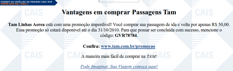 | comentário | Email que informa que a vítima recebeu 95% de desconto em qualquer destino da TAM, ofereçendo a passagem de ida e volta por R$50,00. O link do email direciona para um endereço fora dos domínios TAM (lypage.co.za), que não estava mais disponível no momento... (leia mais) | |