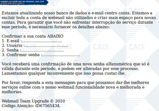 | comentário | Uma das fraudes mais simples que existem. O destinatário envia um email se passando por alguém da equipe de webmail da suposta vítima, solicitando que o usuário responda o email com seu nome de usuário e senha. Note que o email é bem vago e não há nenhuma... (leia mais) | |