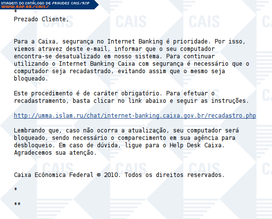 | comentário | Email falso em nome da Caixa Economica Federal informando à vítima que seu computador encontra-se desatualizado e seria necessário um recadastro. O email contém um link para uma página falsa, não hospedada nos servidores da CEF (islam.ru). O phishing já não... (leia mais) | |