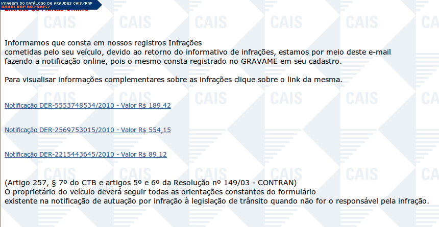 | comentário | Suposta notificação do DER sobre existência de várias infrações de trânsito cometidas pelo veículo da vítima. A mensagem não possui nenhumuma informação detalhada sobre o veículo nem sobre o motorista. A fraude contém links para a vizualização de informações... (leia mais) | |
