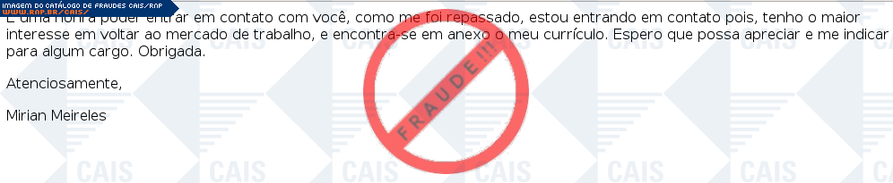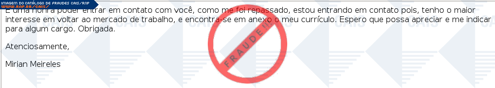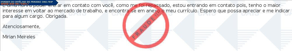 | comentário | O usuário recebe uma mensagem contendo um currículo disponível em anexo, no entanto o arquivo originado é malicioso criado para roubar informações da vítima e instalar outros arquivos fraudulentos com o nome de Trojan.Win32.Generic!BT. | |