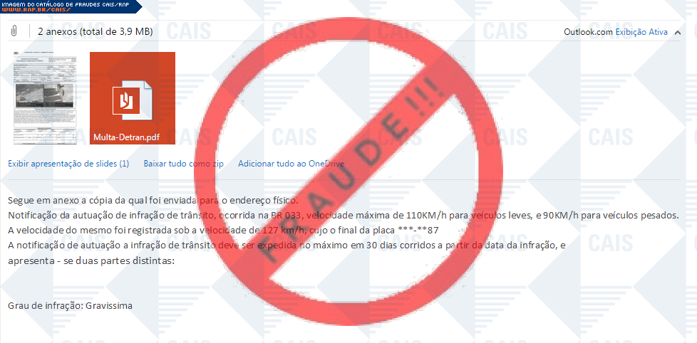 | comentário | A vítima recebe uma mensagem contendo uma infração de trânsito disponível para download no entanto o arquivo gerado é malicioso destinado a roubar informações do usuário com o nome de Trojan.Win32.Generic!BT. | |