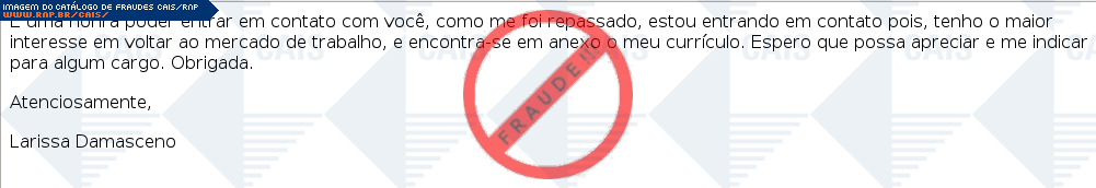| comentário | A vítima recebe uma mensagem contendo um currículo disponível para download, entretanto o arquivo originado é malicioso destinado a roubar as informações do usuário e instalar outros arquivos fraudulentos, com o nome de Trojan.GenericKD.2268920. | |