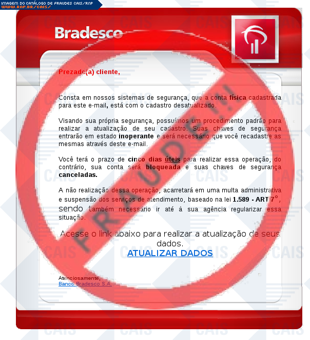 Esta página tem função informativa e educativa. Exibe uma coleção de imagens de phishing scam (fraudes eletrônicas) ou malware (código malicioso) veiculados por meio de spam (e-mail não-solicitado). Trata-se de conteúdo exemplificativo, não exaustivo, uma vez que não é possível contemplar todos os casos de fraudes existentes. Assim, caso você tenha conhecimento de um exemplar que não esteja aqui presente, isto não significa que não seja válido ou real. Inclusive incentivamos que você o envie para análise do CAIS para que, se for o caso, passe a integrar o nosso acervo.