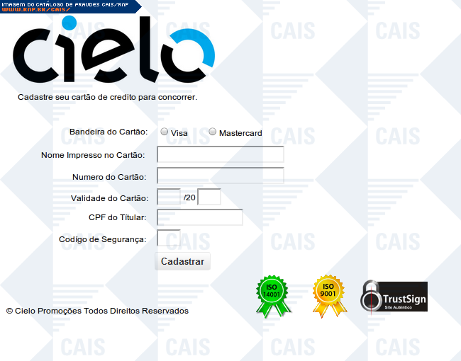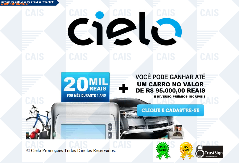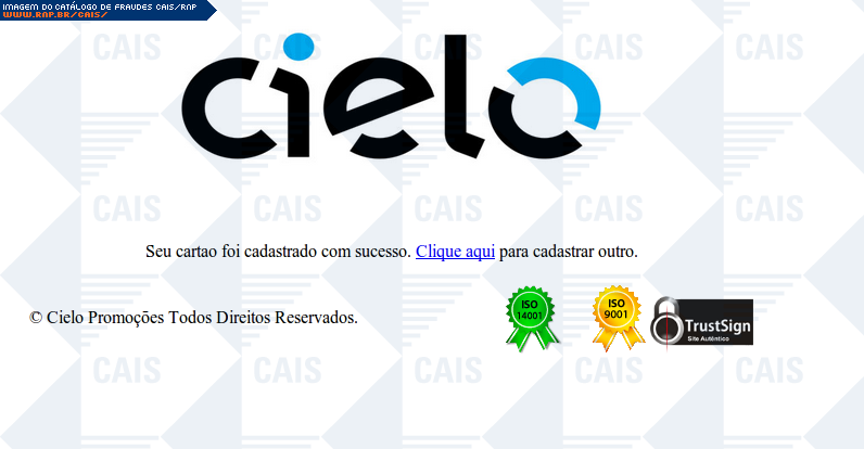| comentário | A fraude usa o nome da Cielo para tentar aliciar a vítima a se cadastrar em uma suposta promoção. O link para o cadastro leva a uma página falsa destinada a coletar dados pessoais da vítima. | |