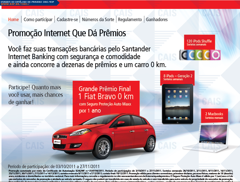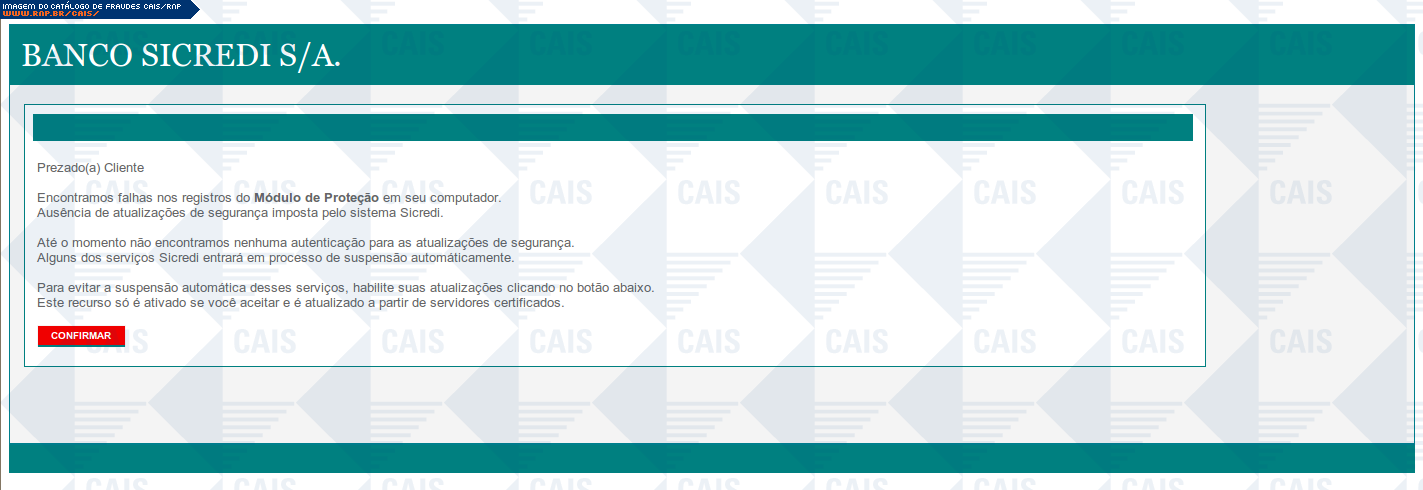 Esta página tem função informativa e educativa. Exibe uma coleção de imagens de phishing scam (fraudes eletrônicas) ou malware (código malicioso) veiculados por meio de spam (e-mail não-solicitado). Trata-se de conteúdo exemplificativo, não exaustivo, uma vez que não é possível contemplar todos os casos de fraudes existentes. Assim, caso você tenha conhecimento de um exemplar que não esteja aqui presente, isto não significa que não seja válido ou real. Inclusive incentivamos que você o envie para análise do CAIS para que, se for o caso, passe a integrar o nosso acervo.