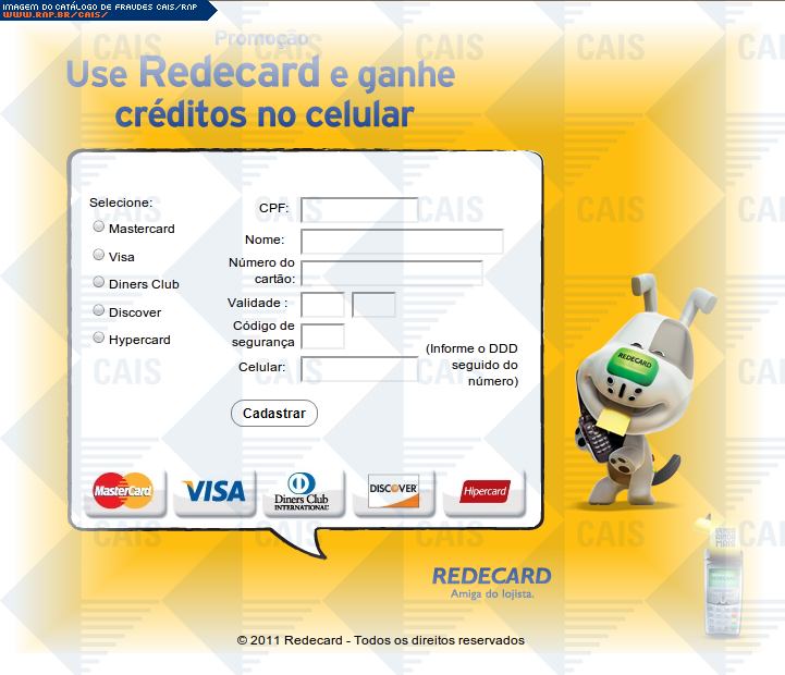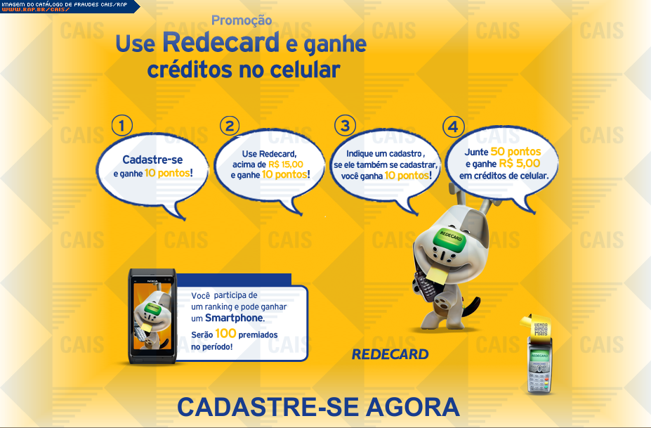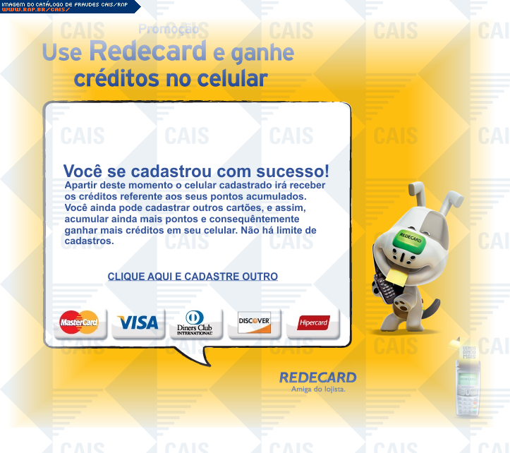| comentário | A fraude contém um link para o cadastro em uma suposta promoção da Redecard em que a vítima concorre a créditos para o celular. O link leva a uma página falsa destinada a roubar dados sobre o cartão de crédito da vítima. | |