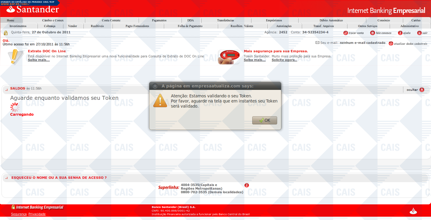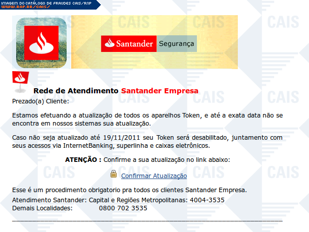 | comentário | A mensagem informa que a vítima deve atualizar seus aparelhos Token através do link. O linke leva a um site falso do banco Santander, destinado a coletar dados da conta bancária da vítma. | |