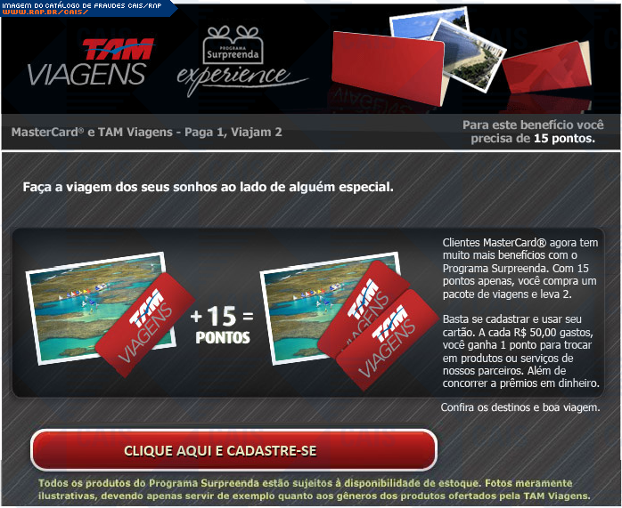 | comentário | Mensagem anunciando promoção da TAM para clientes Mastercard. A fraude fornece um link que seria para cadastro na promoção mas que leva a conteúdo malicioso não disponível no momento da análise. | |